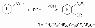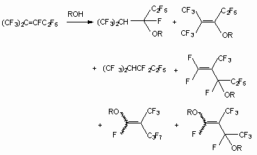 In the reaction of perfluoro-2-methylpent-2-ene with 2-oxypyridine two products are formed, that is, 2[3,3,3-trifluoro-1-pentafluoroethyl-2-trifluoromethyl-propenyloxy]pyridine and 1[3,3,3-trifluoro-1-pentafluoroethyl-2-trifluoromethyl-propenyl]-1H-pyridin-2-one respectively, which is caused by a fluorine atom replacement at double bond under influence O- and N- nucleophiles [50]. The interaction of perfluorocyclobutene with KOCH2Ph issue a product of fluorine atom replacement at double bond with high yield [51]. The behavior of polyfluorinated alcoxylate is similar with alcohols [27].