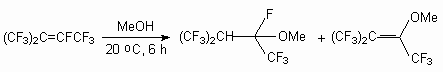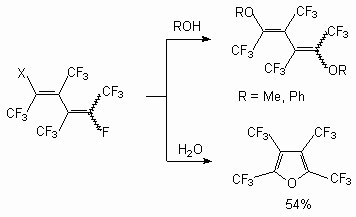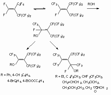 As shown in [30], the interaction between methanol and dimers of hexafluoropropylene in the presence of a KOH or triethylamine in a tetrahydrofuran (acetone, acetonitrile, N,N-dimethylformamide (DMF)) leads to the products of a fluorine atom substitution at double bond as well as the products of addition to it. Depending on ratio of reacting molecules formation of methylic ethers of the non-saturated perfluorinated acids and substituted ketones has observed [20]. Simultaneously, there is also a process of two methoxy groups entry in perfluoro-2-methylpent-2-ene, which produces isomeric 1,3-dimethoxyperfluoro-2-methylpent-1-ene (yield 51 %). Perfluoro-4-methyl-pent-2-ene reacts only with a sodium methylate, producing isomeric 1,3,4-trimethoxy-perfluoro-2-methylpent-1-ene (ratio 3:1) (yield 57 %) [31]. Perfluoro-2-methylpent-2-ene reacts with a,a,w-trihydroperfluoroalcohols with formation of the products of fluorine atom replacement at double bond [27]. It is possible to use t triethylamine and pyridine as the catalyst instead of CsF. The dimer of perfluorobut-2-ene reacts not only with methanol and phenol, yielding disubstituted products, but also with water, yielding perfluorotetramethylfuran [32].