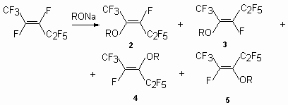 Sodium methylate and sodium ethylate in the reaction with trans-perfluoropent-2-ene form a mixture isomers (2), (3), (4) at the ratio of 9:1:4.5 (general yield 60.2 %), whereas the influence potassium phenolate in suspension of tetrahydrofuran at 0-10 oC results in a mixture of isomers (2) - (4) and isomer (5) [33].