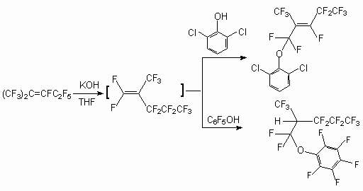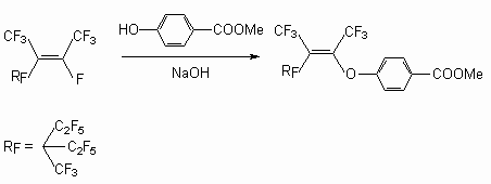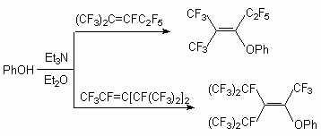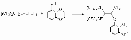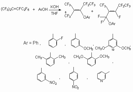 As it was shown earlier, phenol reacts with perfluoro-2-methylpent-2-ene in the presence of a KOH in tetrahydrofuran and produces [3,3,3-trifluoro-1-pentafluoroethyl-2-trifluoro-methyl-propenyloxy]benzene with replacements of fluorine atom at internal double bond [50].