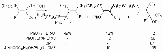 It was shown by us, that the entry into reaction with perfluoro-2-methylpent-2-ene phenols of electronodonating substituents (2-fluorophenol, 3-methoxyphenol, 3,5-dimethoxyphenol) does not change character of formed products. At the same time realization of the reaction under the same conditions with 2,6-dichlorophenol and pentafluorophenol produces (1,1,3,4,4,5,5,5-octafluoro-2-trifluoromethyl-pent-2-enyloxy)-2`,6`-dichlorobenzene and (1,1,3,3,4,4,5,5,5-nonafluoro-2-tri-fluoromethylpentyloxy)-pentafluorobenzene respectively [50].