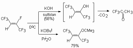 At the same time authors of the [43] have shown a possibility of izomerization of allylic ethers to vinylic ethers under influence of a cesium fluoride. It is important to understand clearly the necessity of strict adherence to the conditions for the occurring of such processes involving nucleophilic reagents and the relative role of substrates in this reaction. (E) and (Z) -2-tert-butoxyperfluorobut-2-enes are formed [44] under the influence of potasium tert-butylate in triglyme at 0 oC on a mixture of E and Z-perfluorobut-2-enes (4:1). 2H-Heptafluorobut-2-ene under action of the bases does not eliminate the hydrogen fluoride with formation of acethylene bond; only the substitution of fluorine atom at a double bond. Thus, the action of KOH in sulpholane on this compound leads to 1,1,1-trifluoroacetone, and the action of potassium tert-butylate in diisopropylic ether yield the product of substitution of fluorine atom at double bond compound (8) [45].