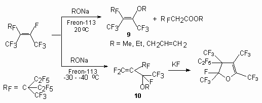 The pentamer of tetrafluoroethylene contains rather mobile atom of a fluorine at internal double bond and at action is alcoholic in the presence Et3N or sodium alcoholate. The structure of the products depends on temperature of the process [47,48]. When the pentamer tetrafluoro-ethylene reacts with alkoxide anions at low temperature (-30 to -40 oC), the product 10, corresponding to the reaction route by kinetic control is isolated, whereas at higher temperatures, thermodynamic control prevails to give the products 9. Compound 10 was converted to dihydrofuran by heating with KF in sulfolane [47].