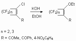 The similar situation is observed and in the reaction of perfluorocycloolefins with alcohols [20,33]. In the reaction of 2-chloroperfluorocycloalkenes with KOH in ethylic alcohol the products of chlorine replacement on ethoxy-group are formed [49].