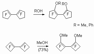 Perfluorobicyclopentene and perfluorobicyclobutene react with methylic alcohol and phenol, yielding products of replacement of a fluorine atoms at double bond, that is, disubstituted methoxylic or phenoxylic derivative [32].