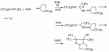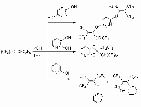As available in a molecule of two OH-group the reaction proceeds with participation of both nucleophilics of the centres. Thus, the perfluoro-2-methylpent-2-ene with pyradazine-3,6-diol yields the 3,5-bis[3,3,3-trifluoro-1-pentafluoroethyl-2-trifluoromethyl-propenyloxy]pyridazine, and with 2,3-dioxypyridine - 2-pentafluoroethyl-2(2,2,2-trifluoro-1-trifluoromethyl-ethyl)-[1,3]-dioxolo[4,5-b]pyridine [50].