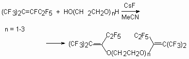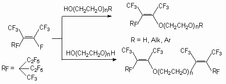 As it has been shown [55], during the reaction of perfluoro-2-methylpent-2-ene with mono-, di-, and triethylene-glycols at a reagents ratio 3:1 in MeCN (or THF, DMF, acetone) in the presence of Et3N (or KOH), the following partially fluorinated vinilic diethers are formed.