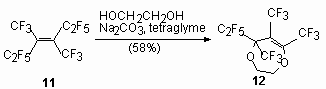 At the same time the main direction of the reactions between internal perfluoroolefins and ethylene-glycol is the formation of cyclic compounds - derivative 1,3-dioxolane. These processes are described for following reactions - ethyleneglycol with perfluorobut-2-ene [56], perfluoro-2-methylpent-2-ene [57, 58], pentamer tetrafluoroethylene [47,59,60], perfluoro-3,4-dimethylhex-2-ene [61]. For example, the interaction of equimolar amounts of ethyleneglycol with perfluoro-2-methylpent-2-ene in bipolar aprotic solvents in the presence of a triethylamine yields a mixture of products containing 2(pentafluoroethyl)-2(2,2,2-trifluoro-1-trifluoromethyl-ethyl)-1,3-dioxolane (72-81 %), 5,7-difluoro-5(pentafluoroethyl)-6-trifluoromethyl-3,5-dihydro-2H-1,3-dioxypine (3-5 %) and (5,5-difluoro-7(pentafluoroethyl)-6-trifluoromethyl-3,5-dihydro-2H-1,3-dioxypine (19-28 %)) [58,59]. At the reaction perfluoro-3,4-dimethylhex-3-ene (11) with ethylene-glycol 5-pentafluoroethyl-5.6.7-tris-(trifluoromethyl)-1,4-dioxypine (12) is obtained [61].