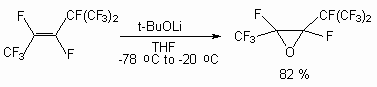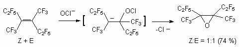 Reactions of internal perfluoroolefins with sodium hypochlorite in alkaline medium (at the presence of acetonitrile) is a sample of epoxidation, including the addition of OCl-anion to double bond and further substitution of chlorine atom by intramolecular attack by intermediate C-carbanion [62-67].
