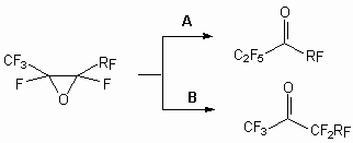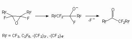 The application of this methodology to fluorine containing systems is essentially enriched by our knowledge of perfluoroolefinic system properties. The reagent’s nature is important too. Thus, calcium hypochlorite was ineffective for epoxidation of fluorine-containing olefins sometimes, whereas lithium tert-bulylperoxide system was extremely effective [70,71]. The activity of perfluoroolefins in epoxydation reactions is corresponding to the activity of nucleophilic reagents. That fact, that oxides of perfluoroolefins easily react with fluoride ion, has allowed to develop a convenient method of synthesis of perfluorinated ketones. It is known perfluoroolefin oxydes easily rearrange, that have allowed to develop a convenient method of perfluorinated ketones synthesis: