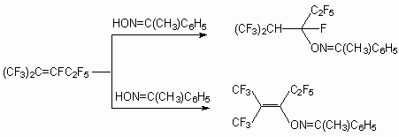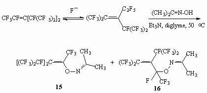 The interaction between trimers of a hexafluoropropylene with oxyme acetome yield two isomeric products (15) and (16) due to the nucleophilic fluorine replacement at double bond.