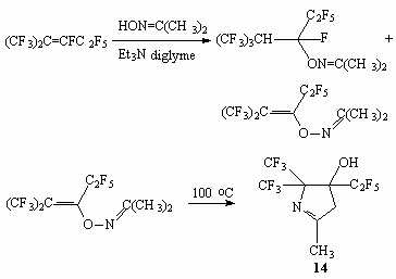 As opposed to terminal perfluoroolefins, which react with oxyme acetone producing only product of double bond connection, internal perfluoroolefins, for example perfluoro-2-methylpent-2-ene, issue mixture of products of connection and replacement of fluorine atom at double bond. And the yield of the latter product is increased with increasing of the basis amount. This is a stable compound when a storage at temperature not exceeding 30 oC, at 100 oC during 1 hour produce 4-oxy-3-methyl-5,5-bis(trifluoromethyl)-4-pentafluoroethylpyrroline-1 (14) [72].