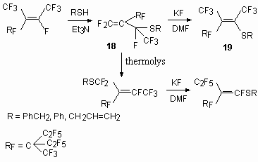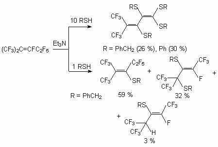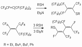 Trimers of a hexafluoropropylene react with mercaptanes at presence Et3N, forming derivative with SR substituents at double bond [49, 80].