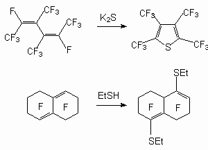 The examples from following articles illustrate these processes for other dienes: in the reaction between perfluoro-3,4-dimethylhex-2,4-diene and K2S a perfluorotetramethylthiophene was obtained [32], and when perfluoro-1,2,3,5,6,8a-hexahydronaphthalene reacted with ethylmercaptane 4,8-bis-ethylsulfanyldodecafluoro-1,2,3,5,6,8a-hexahydronaphthalene was produced [82].
