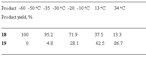 Thus a kinetically controllable product is obtained at temperatures –65 - -30 oC (18), whereas - thermodynamically controllable product is observed at room temperature (19) ( Table 1). Table 1. Temperature effect on the correlation products 18and 19 [78].
