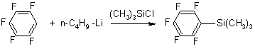 Similar results in the reactions of n-butyllithium (48) and triphenylsilyllithium (49) were obtained earlier: butyllithium in hexane reacted with silane to give 1-(trimethylsilyl)n-butyltetrafluorobenzene in 54% and triphenylsilyllithium in THF gave 1-(trimethylsilyl)-4-(triphenylsilyl)-tetrafluorobenzene in 42.5% yield.