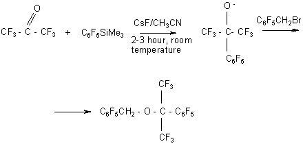 The synthesis of polyfluoroaromatic ethers is made through an intermediate polyfluoroalkooxide, a product of interaction of a perfluorocarbonyl compound with silane, which reacts in situ with pentafluorobenzyl bromide in 40% yield..