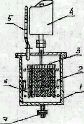 Electrolyzer for electrochemical fluorination 1 - electrolyzer housing; 2 - cooling coiled tube; 3 - electrode package; 4 - reflux condenser; 5 - feed line for organic substrate; 6 - fluoroplast-4 gaskets; 7 - discharge valve. |