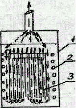 In our tests we used a carbon steel Simons electrolyzer of volume 0.66l (see Fig.1). To recycle HF carried with electrolysis gases the electrolyzer (1) was equipped with a reflux condenser (4). A coiled tube (2) with circulating water was provided in the electrolyzer to cool electrolyte. The interleaved anodes and cathodes were made of nickel plates and formed a package (3).