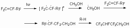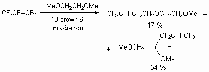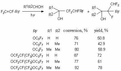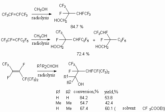 UV-irradiation can be an initiator of these processes, at that the products of alcohols regioselective addition according to multiply bond of fluoroolefine are formed [45]. Both hexafluoropropylene and perfluorinated alkyl vinyl ethers react in such reactions [46]. As a rule, two regioisomeric adducts are formed, the conversion of fluoroolefine is rather high.