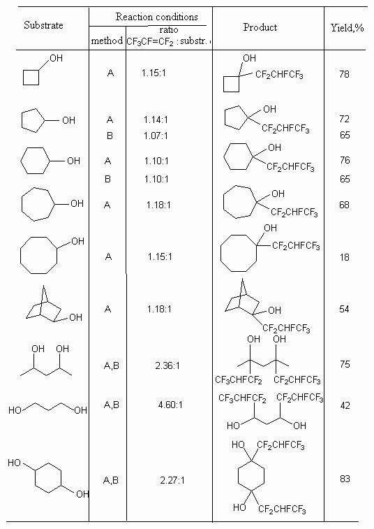 In case of hexafluoropropylene reactions with different cyclic and acyclic diols in these conditions the replacement of hydrogen atom according to both tertiary carbon atoms with CF2CHFCF2 group takes place (table 1) [49].