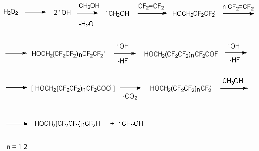 Partly fluorinated primary alcohols like H(CF2CF2)nCH2OH (n = 1-6), the production of which is based on interaction of tetrafluoroethylene with methyl alcohol at increased temperature and pressure in the presence of peroxide initiator with decomposition point higher than 100 oC (tert-butyl diperoxide,tert-butylperoxy-2-ethylhexanoate , carboxylic acids peroxides, ethers peroxides, 2,5-bis-(tert-butylperoxy)-2,5-dimethylhexane and others) [7-21]. Thus alcohols ROH (R = CHCF2CF2CH2, CF3CHFCF2CH2) are obtained by heating of peroxide initiator (3,5-15,4 %) in alcohol at 110-120 oC and pressure of 3,4-6,5 bar with control of fluoroolefine introduction and increasing of pressure up to 9 - 15 bar at 150 oC . The process is carried out at proportion of fluoroolefine / initiator (7.2 - 28.1 ) / 1 and in presence of 0.2-1.2 % polyfluorinated alcohol [8]. At these conditions the initiator decompose to radical and its reaction with alcohol is induced. For example, CHF2CF2CH2OH with the yield of 99.8 % is obtained at reaction of methyl alcohol and tetrafluoroethylene in the presence of di(tert-butyl)peroxide [8].