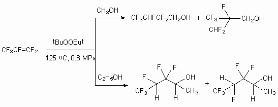 In case of hexafluoropropylene reaction with methyl and ethyl alcohols in the presence of tert-butyl peroxide only 2,2,3,4,4,4-hexafluorobutan-1-ol and 3,3,4,5,5,5-hexafluoropentan-2-ol are formed respectively. The opportunity of two radicals generation out of hexafluoropropylene according to assymentric double bound supposes the formation of two isomeric alcohols. In fact, at interaction of hexafluoropropylene and methyl alcohol the formation of two alcohols and 2-difluoromethyl-2,3,3,3-tetrafluoropropan-1-ol (ratio 93:5) is recorded, while the reaction with ethyl alcohol produces mixture consisting of two stable conformers (ratio 58:38) [43].