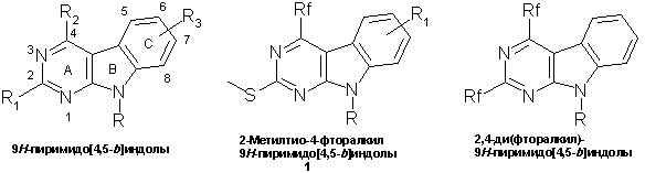 Ключевые слова: 9Н-пиримидо[4,5-b]индолы, 2-метилтио-4-фторалкил-9Н-пиримидо[4,5-b]индолы, внутримолекулярная циклизация по Хеку, 2-метилтио-6-(фторалкил)пиримидинон-4(3Н)-оны