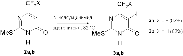Стандартная процедура С5-иодирования пиримидонов – реакция с иодом в водном растворе NaOH [21] в случае пиримидинонов (2a,b) привела к неудовлетворительным результатам. Оптимальной оказалась реакция с N-иодсукцинимидом в кипящем ацетонитриле (схема 3) [22]. 5-Иодпиримидоны (3a,b) были выделены с выходом 92% и 82% соответственно.