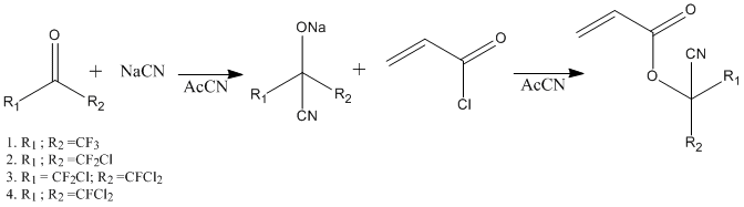 Нами разработаны методы синтеза галогенированных (фтор- и хлорсодержащих) мономеров, изготовлен ряд цианоперфтор- и цианохлорперфторалкилакрилатов, см. Рис. 1. Мономеры были получены реакцией соответствующих ацетонов с цианидом натрия, с последующим взаимодействием с акролеилхлоридом, которое приводило к образованию требуемых акрилатов. Данная реакция представляет собой одностадийный двухэтапный процесс, проводимый в ацетонитриле при 0оС.