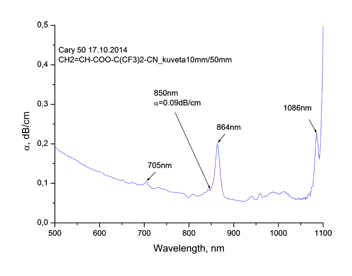 Спектры поглощения синтезированных мономеров в «датакоммуникационной» области длин волн вблизи 0.85 мкм, измеренные на спектрофотометре Cary-50, представлены на Рис. 2. Видно, что в спектрах наблюдаются полосы поглощения, обусловленные валентными колебаниями атомов, входящих в молекулу мономера, а также окна прозрачности. Линии поглощения с центрами вблизи 865 и 705 нм обусловлены комбинационными тонами, связанными с двойными C=C связями [17].