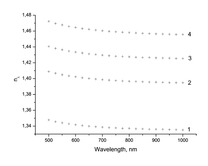 Рис. 3. Дисперсионные зависимости показателя преломления мономеров CH2=CH-COO-C(CF3)2-CN (1), CH2=CH-COO-C(CF2Cl)2-CN (2), CH2=CH-COO-C(CF2Cl)(CFCl2)-CN (3), CH2=CH-COO-C(CFCl2)2-CN (4) вблизи 0.85 мкм, измеренные на спектроскопическом рефрактометре при 20 °С.