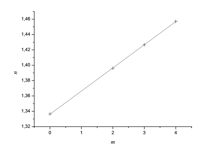 Как видно из Табл. 2, коэффициент поглощения мономеров на длине волны λ = 0.85 мкм лежит в пределах 0.04 - 0.09 дБ/см, показатель преломления меняется от 1.336 до 1.457. Повышение степени хлорирования приводит к увеличению рефракции мономеров, см. Рис. 4.