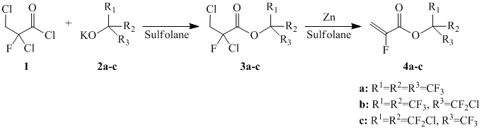 Синтез α-фторакрилатов 4a-c осуществлен по методу [7] реакцией хлорангидрида (1) c алкоголятами третичных спиртов 2а-с с последующим дехлорированием образующихся сложных эфиров 3а-с (см. Схему 1):