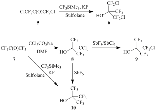 1,1,1,3,3,3-Гексафтор-2-(трифторметил)пропан-2-ил 2-фторакрилат (4a). CH2=CFCO2C(CF3)3. Т.кип. 19-20°С(15 Торр). ЯМР 1H δ: 5.7÷6.2 (м, CH2=); ЯМР 19F δ: -119.4 (м, 1F, CFCl), -71.7 (м, 9F, CF3).
