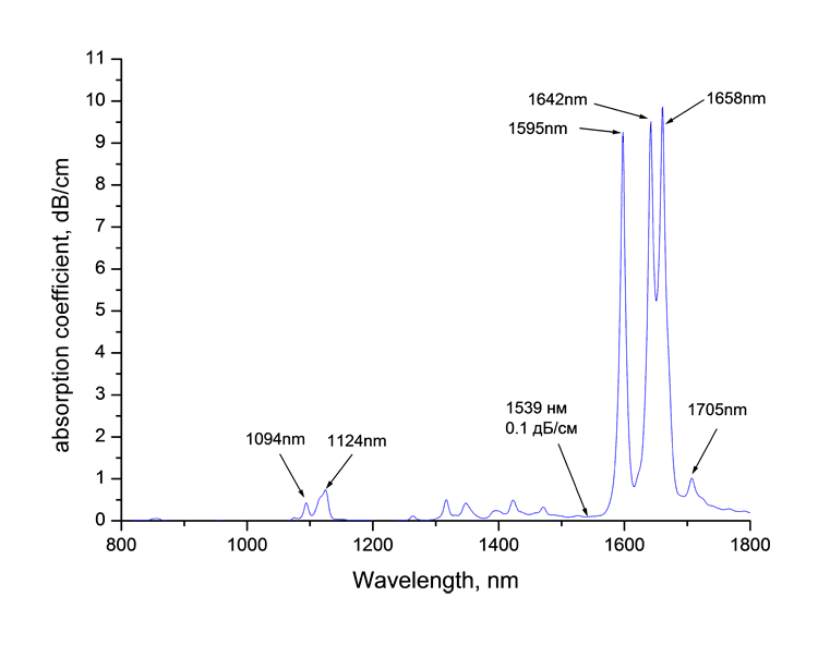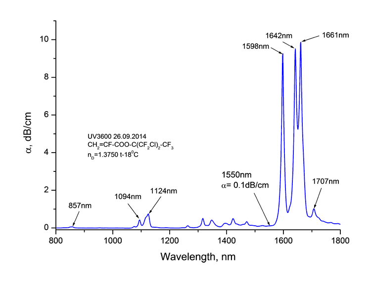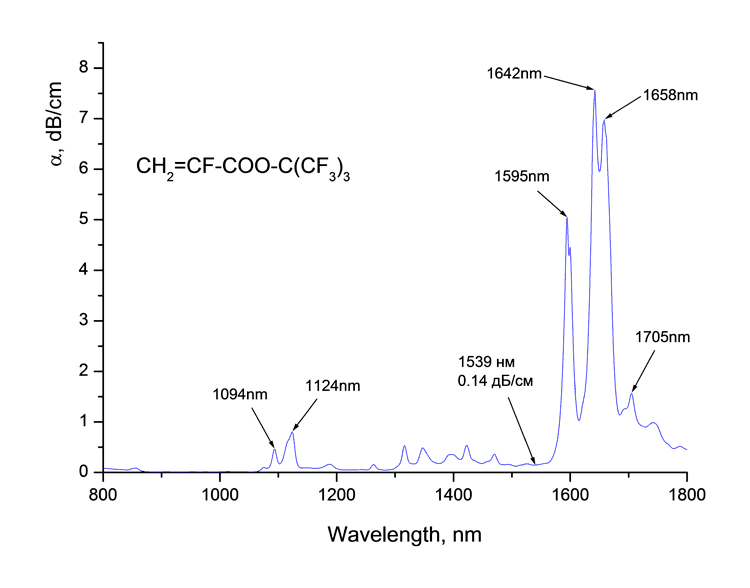 Спектры поглощения синтезированных мономеров в телекоммуникационных диапазонах длин волн вблизи 0.85, 1.3 и 1.55 мкм, измеренные на спектрофотометре Shimadzu UV3600, представлены на Рис. 1. В спектрах наблюдаются полосы поглощения, а также окна прозрачности. Коэффициент поглощения мономеров вблизи 1.55 мкм составляет 0.1 дБ/см.