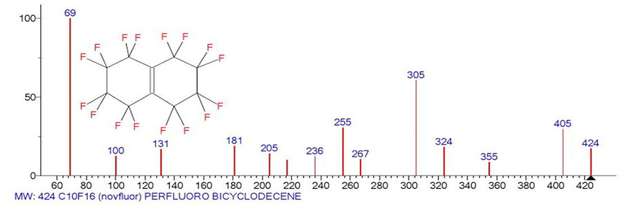 В настоящем сообщении представлены масс-спектры четырех перфторбициклоизомеров C10F16 из библиотек NIST. Один из которых перфторбициклодецен, а три других изомера - производные тетрадекафториндена с группой CF3 в третьем, восьмом и втором положении.