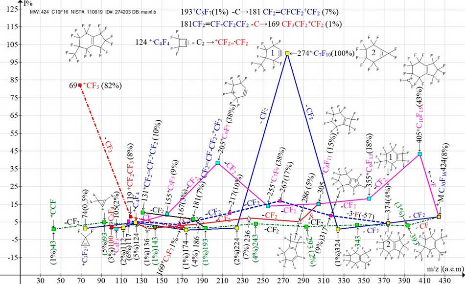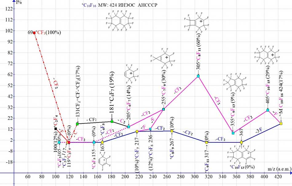 Представленный на Рисунке1 масс-спектр перфторбициклодецена был снят в 1978 г., вероятно, на масс-спектрометре МХ-1310. Он содержит только четырнадцать пиков. До настоящего времени этот масс-спектр является единственным снятым спектром перфторфторбициклодецена. Две главных его ионных серии (Рисунок 2) начинаются с первичных отрывов одного, а также синхронного отрыва трех атомов фтора. При отрыве одного атома фтора возникает серия ионов с последней значащей цифрой массы «5», с наиболее интенсивными пиками, отмеченная фиолетовым цветом. После первичного отрыва трех атомов фтора возникает вторая ионная серии с последней значащей цифрой «7», с менее интенсивными пиками, отмеченная на Рисунке 2 синим цветом. В ионной серии, начинающейся с первичного отрыва атома фтора, происходит также вторичный последовательный отрыв двух атомов фтора, в результате которого более интенсивная (фиолетовая) серия ионов соединяется с менее интенсивной (синей) ионной серией.