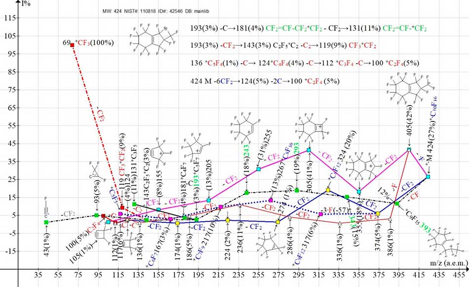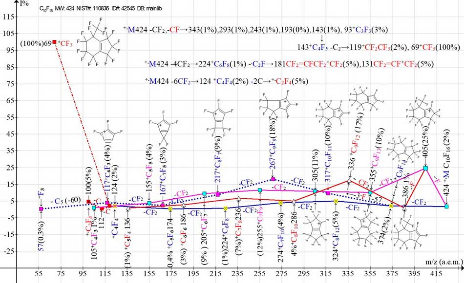 Рисунок 5. Две главных ионных серии (М -F, M -CF2) и их разветвления в масс-спектре 2-трифторметилперфторбицикло[4,3,0]-нона-1(6)-ена С10F16 MW: 424 NIST#: 110836 ID#: 42545 DB: mainlib.