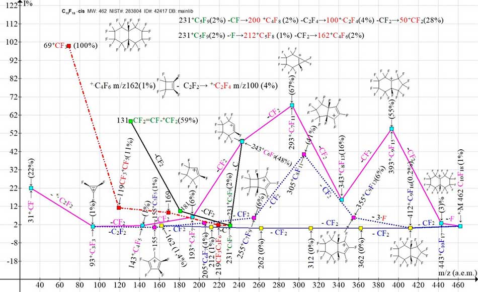 Рисунок 6. Две главных ионных серии (М -F, M -CF2) и их разветвления в масс-спектре C10F18 цис-перфтордекалина, MW: 462 (A. Плешкова, ИНЭОС АН СССР) NIST#: 283804 ID#: 42417 DB: mainlib.