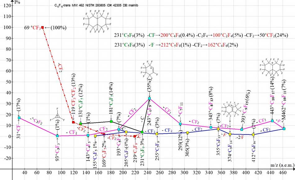 Рисунок 7. Две главных ионных серии (М -.F, M -CF2) и их разветвления в масс-спектре C10F18 транс-перфтордекалина, MW: 462 (А. Плешкова, ИНЭОС АН СССР) NIST#: 283805 ID#: 42305 DB: mainlib.