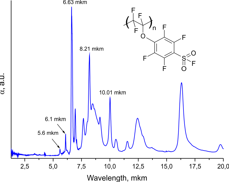 На Рис. 3 приведен ИК спектр поглощения гомополимера E8S, нанесенного на KBr подложку. Спектр был измерен на ИК-спектрометре Shimadzu 8400S. Как следует из Рис. 3, гомополимер E8S имеет заметное поглощение в области длин волн выше 5 мкм, в телекоммуникационном диапазоне спектра вблизи 1.3 и 1.5 мкм поглощение гомополимера мало.