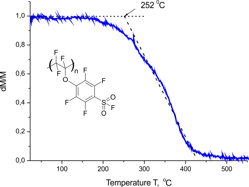 Электрохимические устройства, преобразующие химическую энергию в электрическую, такие как водородные топливные элементы с полимерными протонообменными мембранами, представляют значительный интерес для научных исследований и промышленности из-за высокой эффективности преобразования энергии, незначительного воздействия на окружающую среду и возможности использования в самых различных приложениях от портативных электронных устройств до автомобилей, поездов, плавательных судов и летательных аппаратов, в том числе космических [1]. Одним из важнейших элементов топливной ячейки является протонообменная мембрана, осуществляющая транспорт протонов, образующихся в ходе каталитического окисления водорода на аноде и участвующая в восстановлении кислорода на катоде с образованием воды, а также препятствующая прямому неконтролируемому взаимодействию водорода с кислородом [2-3]. В настоящее время значительное распространение получили низкотемпературные топливные элементы с протонообменными мембранами на основе фторированных сульфокислотных полимеров, например, широко исследуемых и коммерчески доступных мембран Nafion, Aciplex, Aquivion, Dyneon. Такие мембраны характеризуются высокой химической, термической и механической стабильностью, имеют хорошую протонную проводимость при высокой степени гидратации [4-10]. Для создания и совершенствования протонообменных мембран синтезировано большое число фтормономеров, в том числе содержащих различные протоногенные группы [11-20]. Так, нами разработан метод синтеза нового нафионоподобного мономера: FSO2C6F4OCF=CF2, в котором FSO2- группа связана с CF2=CFO- заместителем не перфторалифатическим, а перфторфенильным фрагментом [21]. Настоящая работа посвящена изучению полимеризационной активности данного мономера.