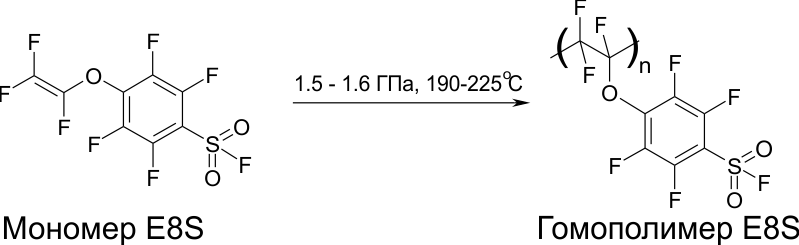 Установлено, что полимеризация мономера FSO2C6F4OCF=CF2 (именуемого далее E8S) протекает при давлении 1,5 - 1,6 ГПа и температурах 190 ÷ 225 °С без использования каких-либо инициаторов радикальной полимеризации, см. Схему 1. Полученный гомополимер E8S представляет собой порошкообразное вещество белого цвета.