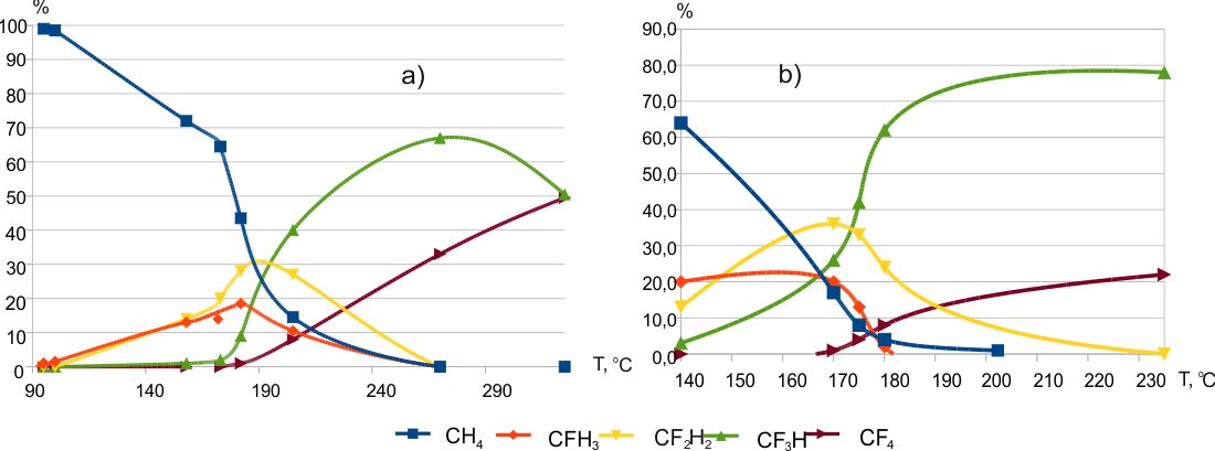 Рис. 1. Зависимость состава продуктов фторирования метана трифторидом кобальта от температуры (а- 5% смесь CH4 и гелия, b- чистый CH4) [3].