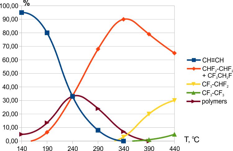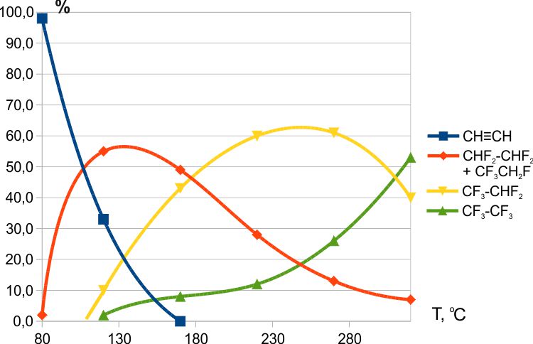 Взаимодействие ацетилена с CoF3 начиналось при ≈ 80°С, при 250°С в продуктах взаимодействия образовывалось более 50% пентафторэтана (Рис.3) [5].