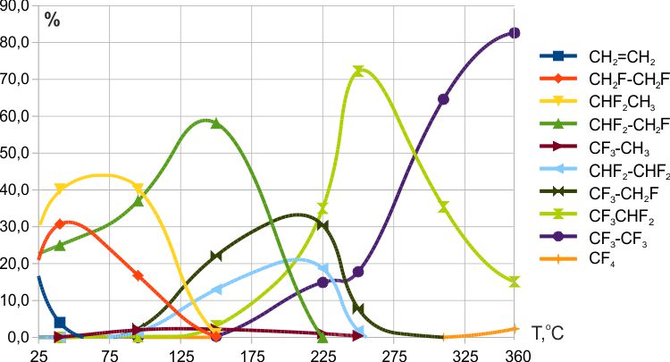 В работе [3] были опубликованы результаты фторирования метана, дифторметана и трифторметана трифторидом кобальта (Рис.1). В статье [8] приведены более подробные данные по фторированию дифторметана в диапазоне температур 184÷351ºC и трифторметана в диапазоне температур 210÷362ºC.