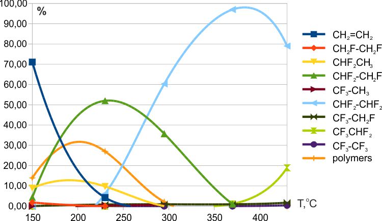 - Способность к адсорбции никак не может влиять на соотношение изомеров тетрафторэтана, поскольку фторирование при небольших временах контакта проходит почти исключительно через относительно высококипящий 1,1,2-трифторэтан (Ткип=+5°C).