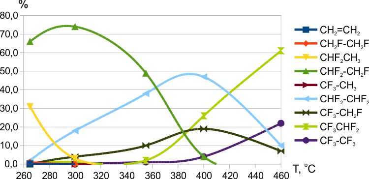 Рис. 6. Зависимость состава продуктов фторирования этилена трифторидом марганца от температуры (интервал 265-460ºС, время контакта ≈7 мин.).